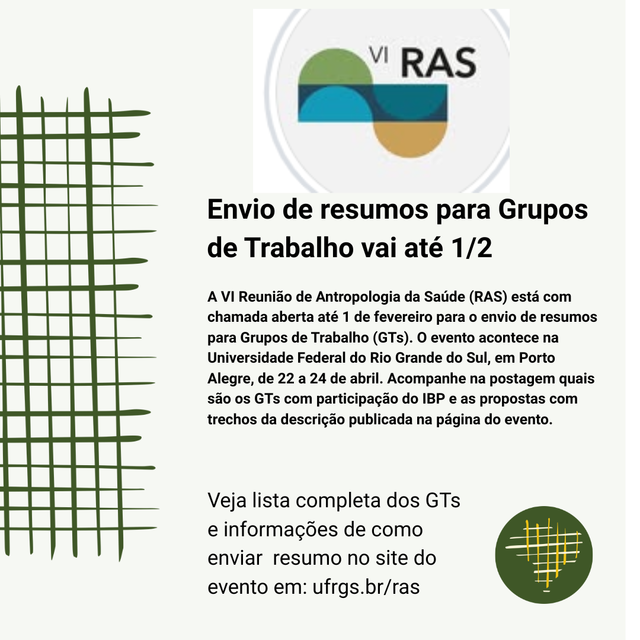 A VI Reunião de Antropologia da Saúde (RAS) está com chamada aberta até 1 de fevereiro para o envio de resumos para Grupos de Trabalho (GTs). O evento acontece na Universidade Federal do Rio Grande do Sul, em Porto Alegre, de 22 a 24 de abril. Dos 18 GTs com inscrições abertas, 6 estão sendo organizados por pesquisadores e pesquisadoras do INCT Brasil Plural. No Instagram (@inctbrasilplural) temos uma postagem com as informações gerais, com cards de cada um dos GTs com participação do IBP e as propostas com trechos da descrição publicada na página do evento. Veja a lista completa dos Grupos de Trabalho e informações de como enviar seu resumo no site do evento em www.ufrgs.br/ras.